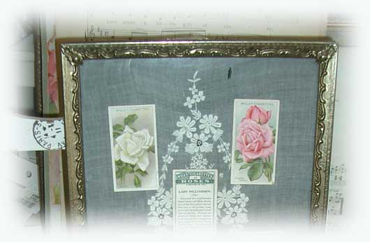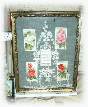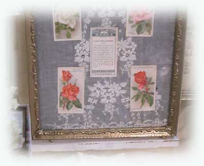 | #frame018 ¥2800SOLD OUT (D21cm x H26cm) | アンティーク刺繍の ボイルの生地に 薔薇のアンティークカードを ディスプレイしています。 |