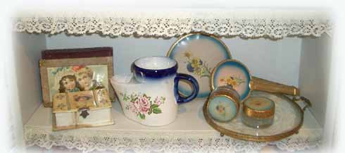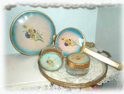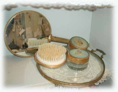 アンティークバニティセット \16000 手鏡(Ф14cmx 長さ30.5cm) ブラシ ペーストジャー2個(Ф6cm) ガラスのレーストレー(Ф19cm) 片側の持ち手は有りません。 |